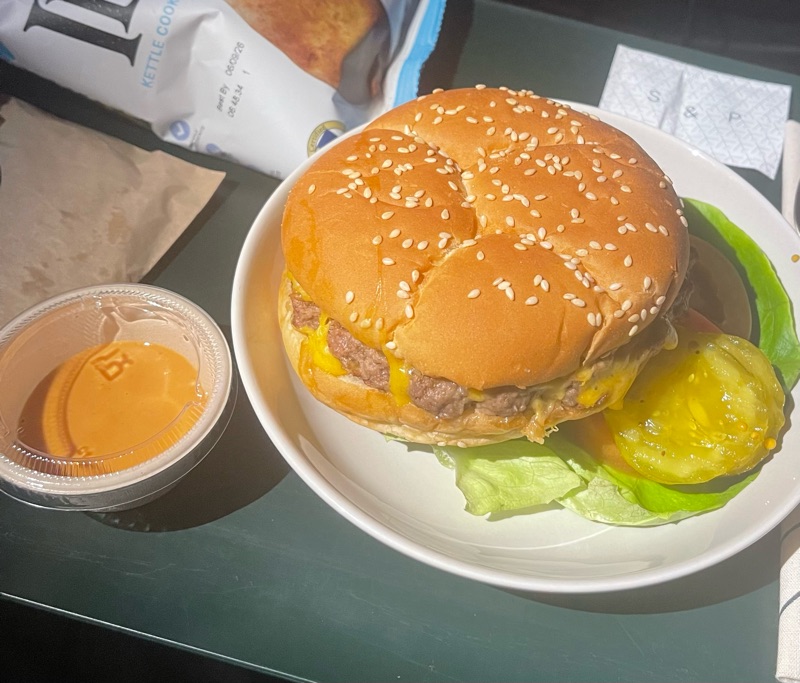 On our outbound flights we were upgraded to First and finally got to dine on Alaska's famous Tillamook Cheeseburger. It's okay and not too messy.