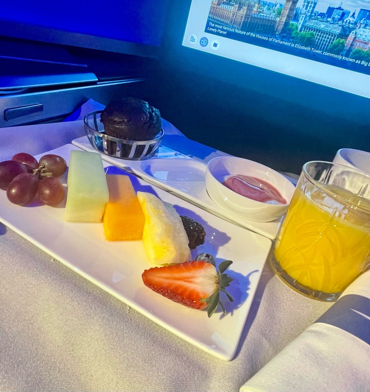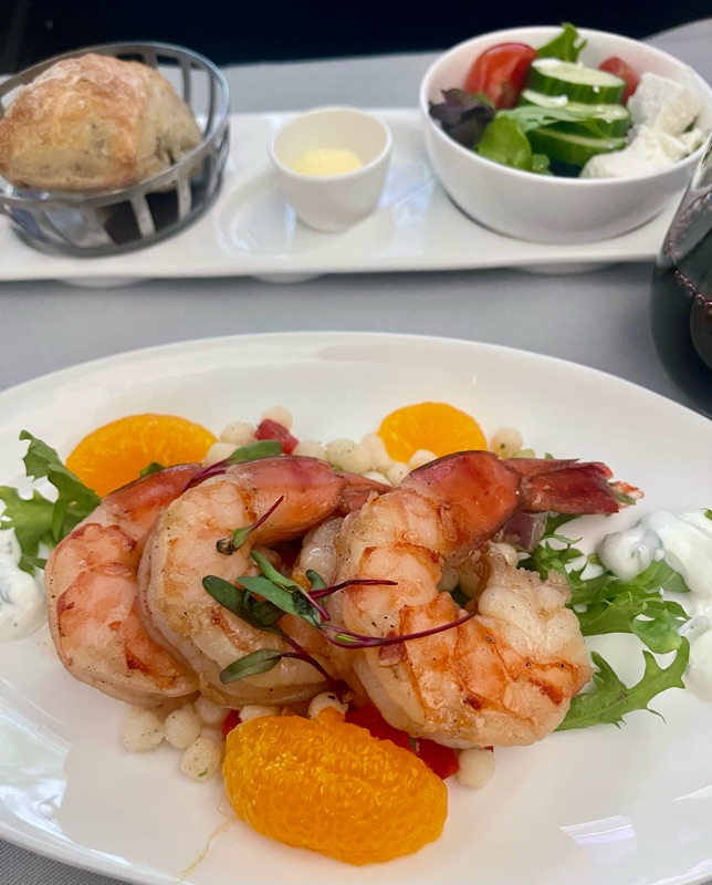 Brian limited himself to an appetizer and found the jumbo shrimp delicious and filling. He caught perhaps four hours of sleep, while Kathy didn't sleep at all. Brian opted for a continental breakfast, while Kathy limited herself to coffee.