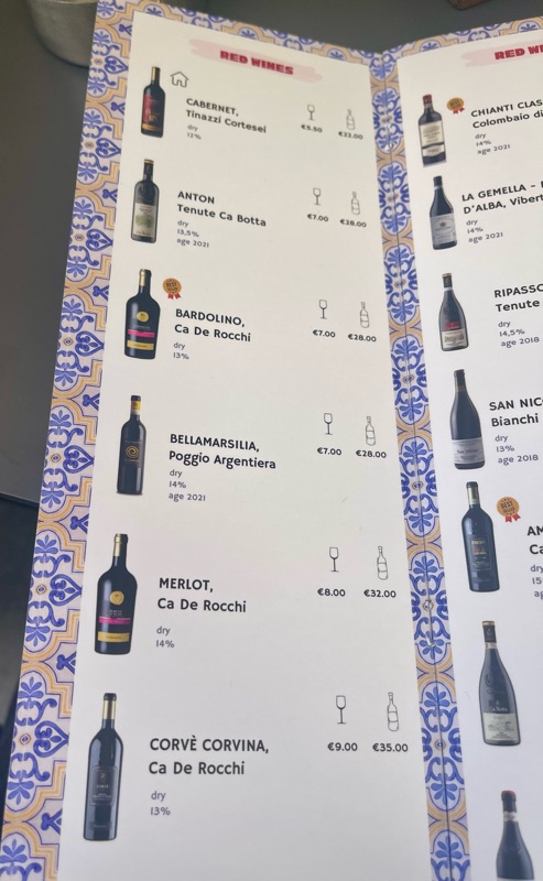 Notice the thin somewhat soggy crust and "skimpy" toppings by North American standards. That's authentic Italian-style pizza and tasty in its own way. It featured an impressive Italian wine-by-the-glass menu.