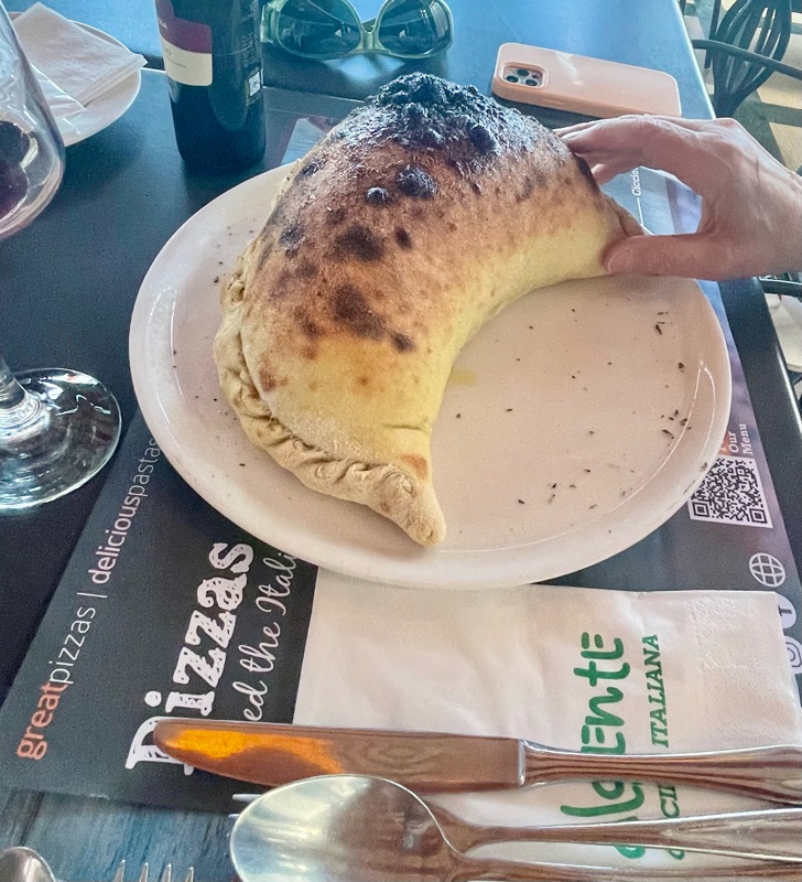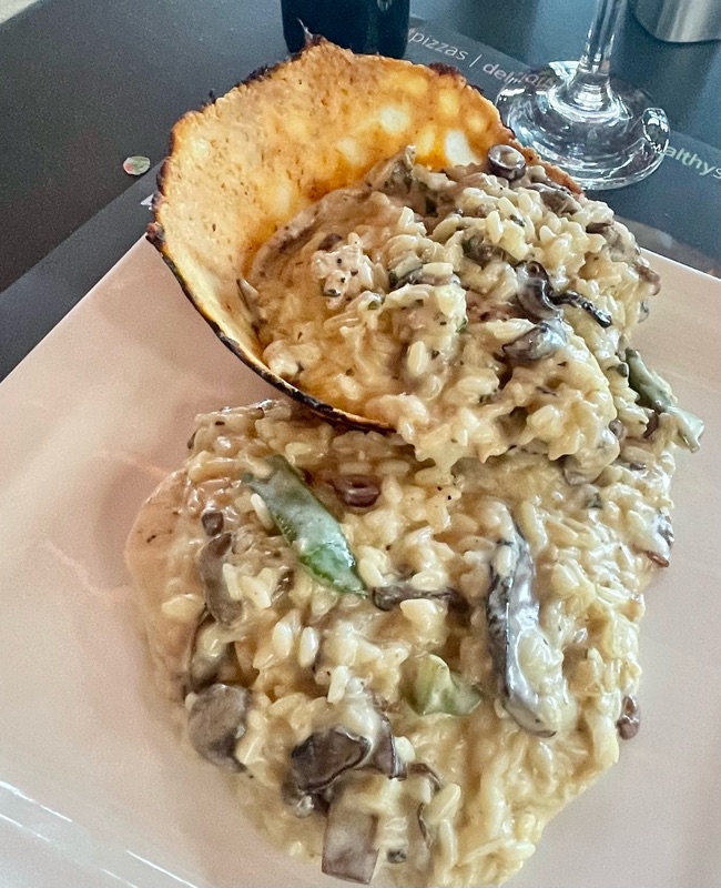 The exterior of Kathy's Calzone was impressive, but all that she found inside was a bland combination of luncheon-meat ham, not the prosciutto advertised, mushrooms, and cheese. Brian's risotto dish, nesting in a Parmesan shell, was more successful.